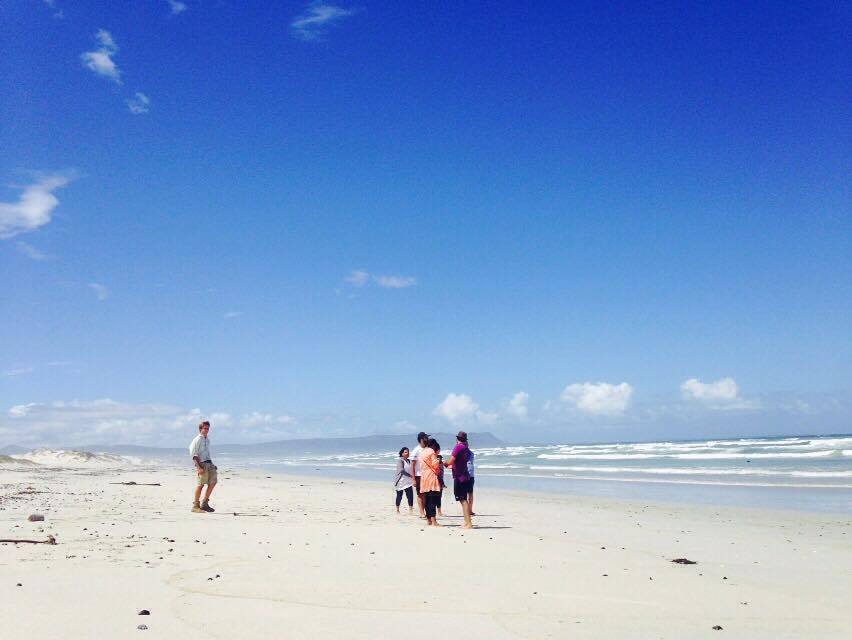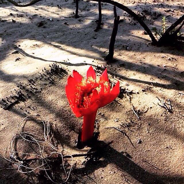 We passed an area where it recently burnt and from the scorched earth burst most beautiful blood red flowers. Once we reached the beach we climbed up and over the huge dune and had a swim in the sea and took a short walk on the vast Walker Bay beach that stretches from Hermanus to Gansbaai. Other guests from Mosaic were already there on a game drive and offered us cold refreshments from the Mosaic cooler box. It was heaven!