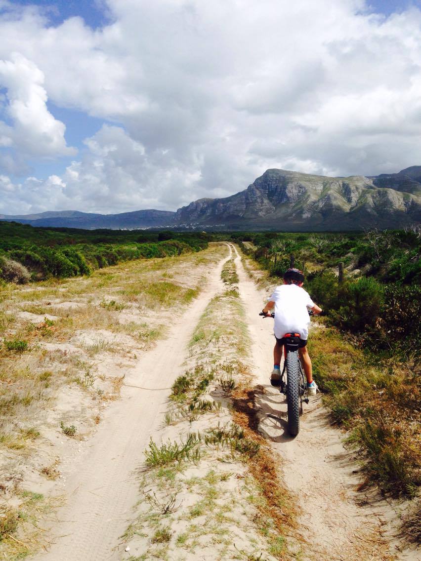 Upon arrival we were met by Mosaic’s manager, Marcelino, who patiently fitted our helmets and explained the best routes to ride and where everything on the bike was – including a puncture kit. (In the end I just took his phone number and said that I’d call him for help if needed as I am incapable of fixing anything more complicated than a sandwich). And then we were on our way. We rode out towards the beach, about 5km away. First on a dirt road and then into the Walker Bay Marine reserve where a comfortable sandy path led us towards the beach. The road was easy to follow and the natural beauty was magnificent – and I had plenty of time to admire the flowers and the mountains because I had to stop to rest quite often (to the great disgust of my son).