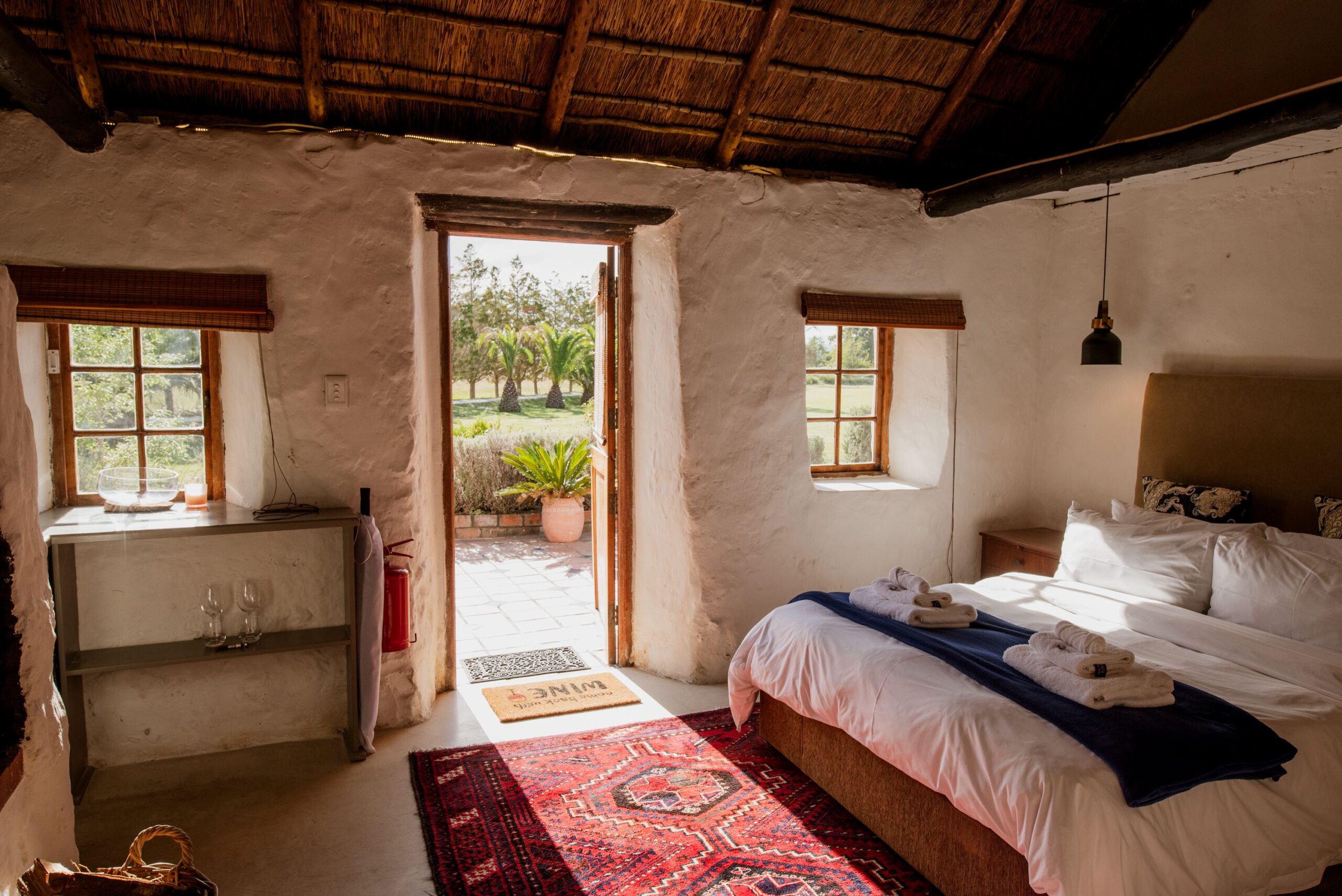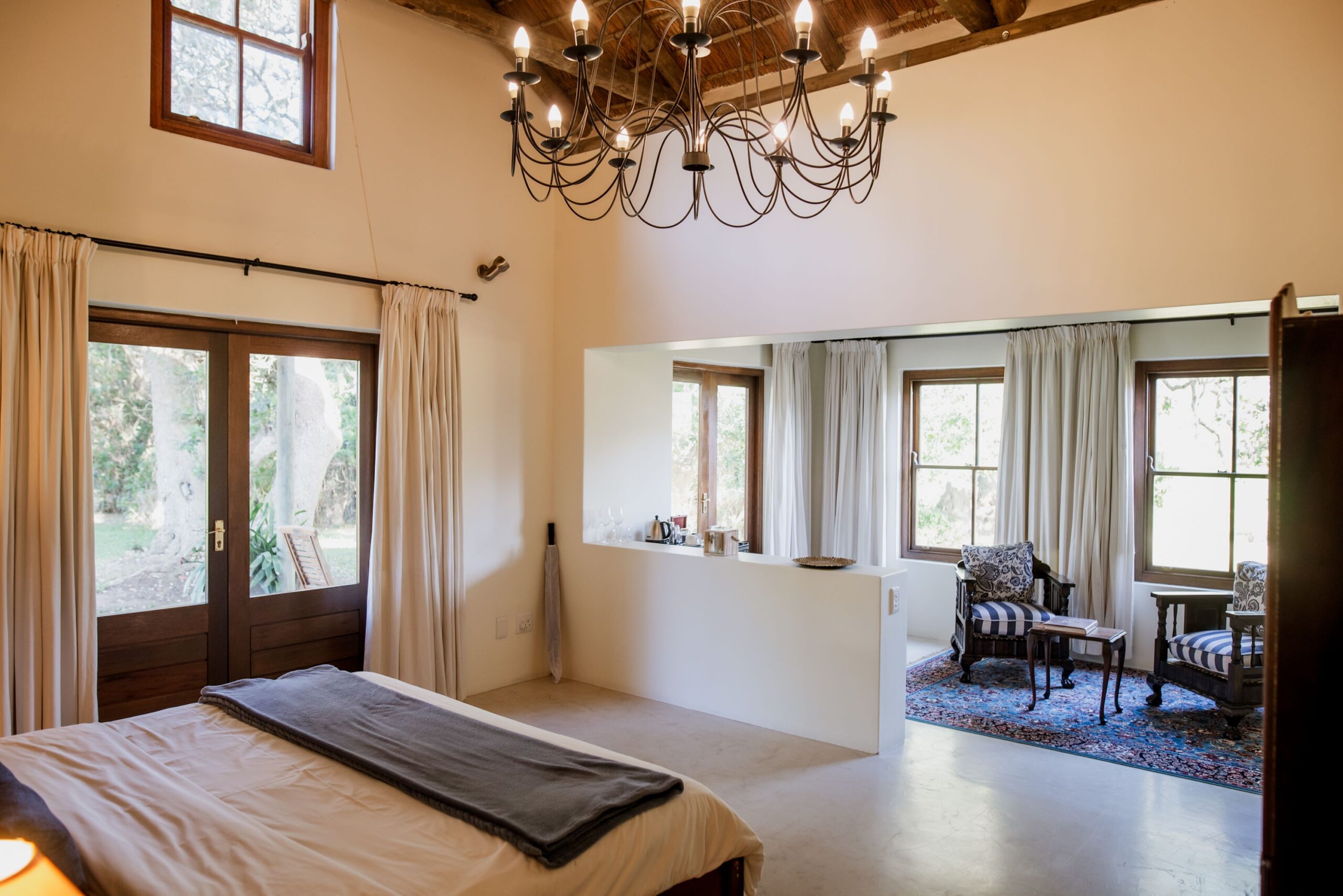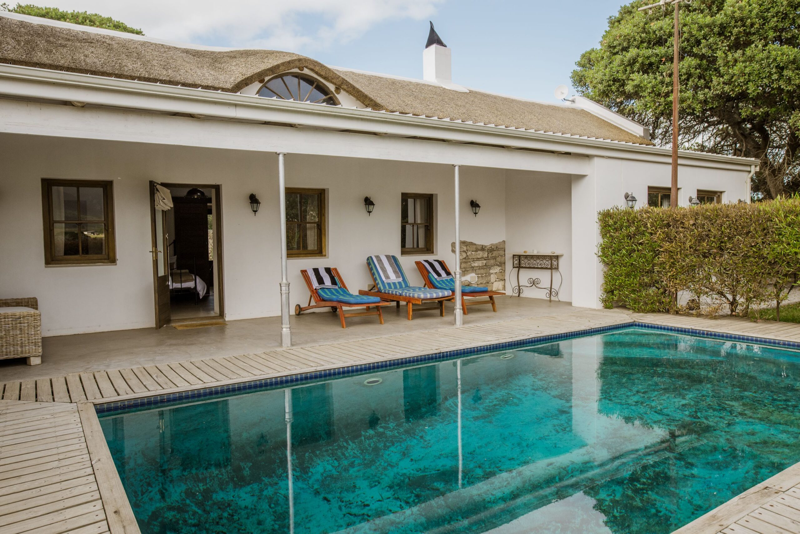 - Riverside Suites: Nestled under majestic Milkwood trees, our Riverside Cottages offer three suites in an authentic South African house with thatched roof on the Klein River side of our farm. The historic cottage has been renovated with extreme attention to detail, trying to preserve it’s ancient charme. One of the Estate’s two jettys to the Klein River is in walking distance. Two of the suites each offer a large bedroom with a breathtaking view on the Maanskynkop mountain, a comfortable sittingroom and a large en-suite bathroom (with shower and bathtub). The third suite additionally features an open living plan, a nice fireplace for the cooler days, a shaded patio for a relaxing time, and a private swimming pool.